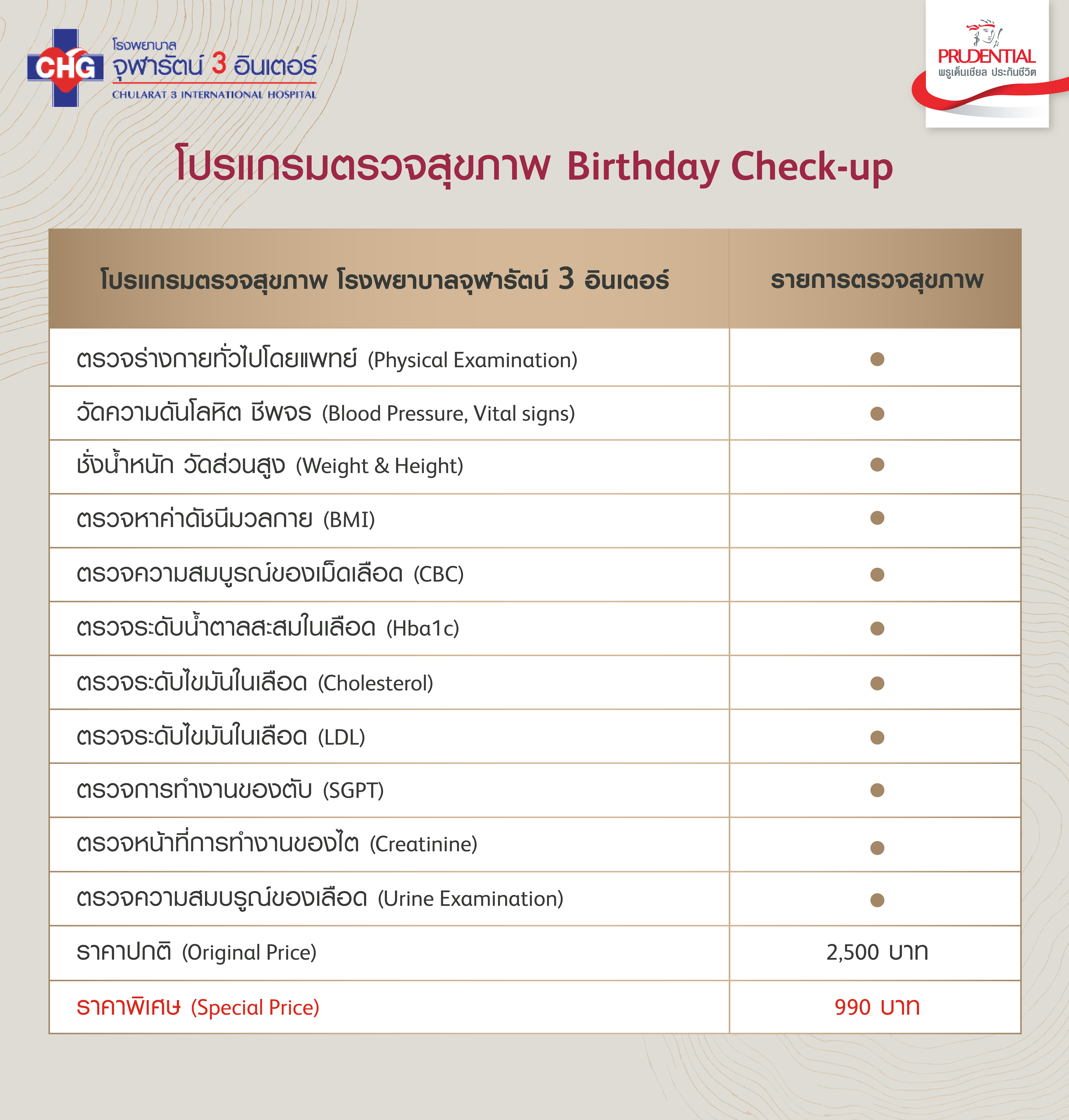 รับสิทธิ์ตรวจสุขภาพในเดือนเกิดราคาพิเศษเพียง 990 บาท จากราคาปกติ 2,520 บาท ที่โรงพยาบาลจุฬารัตน์ 3 อินเตอร์