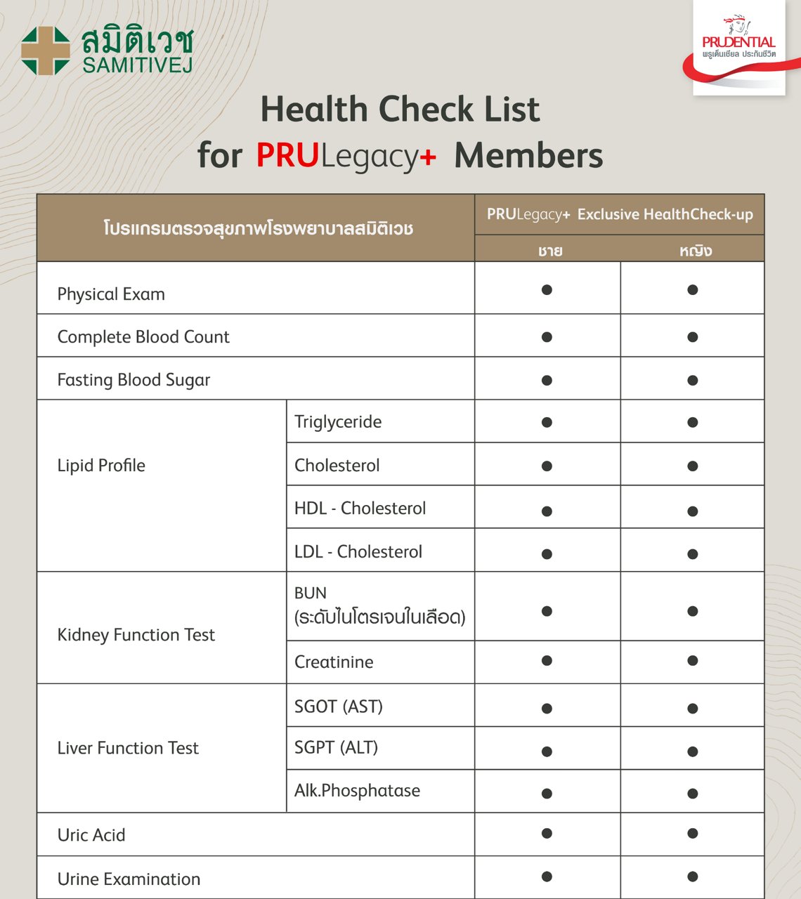 Exclusive privileges for PRULegacy+ members, receive PRULegacy+ Exclusive Health Check-up at Samitivej Hospital. (Samitivej Sukhumvit and Samitivej Srinakarin)