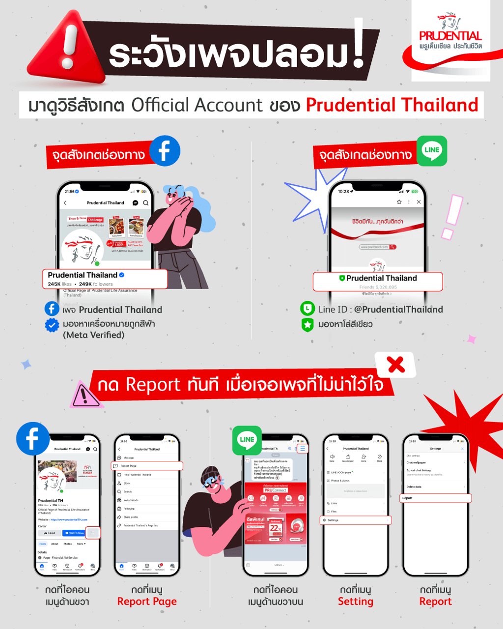 เมื่อมั่นใจแล้วว่าเป็นช่องทางปลอมของมิจฉาชีพ แนะนำให้กดปุ่มรายงานปัญหาและบล็อคแอคเคาท์นั้นทันที สำหรับ Facebook แอคเคาท์ของพรูเด็นเชียล ประเทศไทย สามารถกดเพิ่มเพื่อนได้ที่นี่ https://www.facebook.com/PrudentialThai