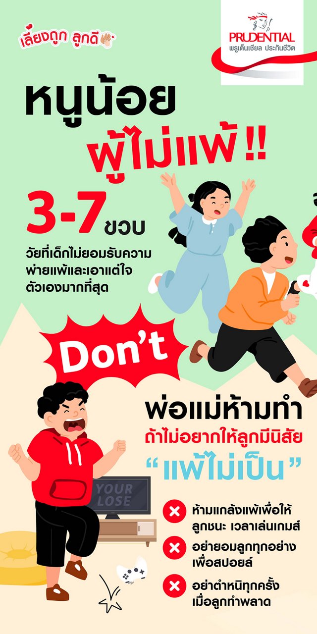 ‘รู้แพ้ รู้ชนะ รู้อภัย’ เป็นสิ่งที่เราถูกสอนกันมารุ่นสู่รุ่น เพราะการแพ้ชนะเป็นเรื่องที่ทุกคนต้องเจอ การสอนให้ลูกเข้าใจธรรมชาติของการแข่งขันจะเป็นการสร้างทักษะการใช้ชีวิตให้กับเขาเหมือนการฉีดวัคซีนสร้างภูมินั่นแหละ ลูกอาจจะร้องไห้ในช่วงแรก แต่หลังจากนั้นเขาจะเรียนรู้ว่าการแพ้ชนะเป็นเรื่องธรรมดาของชีวิต ลองเปลี่ยนจากการพูดว่า ‘ทำไมแค่นี้ไม่ชนะ แม่ผิดหวังมากเลยนะ’ เป็น ‘ไม่เป็นไรนะลูก ถึงคราวนี้จะแพ้ แต่แม่รู้ว่าหนูได้พยายามเต็มที่แล้ว คราวหน้าเรามาสู้กันใหม่เนอะ’