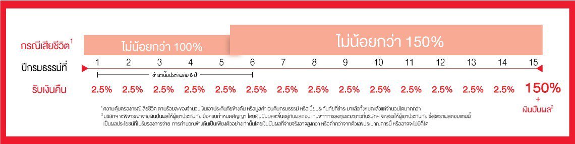 รับเงินคืนปีละ 2.5% ของจำนวนเงินเอาประกันภัย ตั้งแต่สิ้นปีกรมธรรม์ที่ 1-14 และ 150% ของจำนวนเงินเอาประกันภัยเมื่อครบกำหนดสัญญา